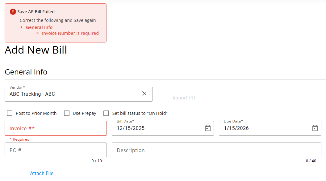 - The PO # and Description fields are optional. If a PO was imported, the PO # and Description default and the PO # cannot be changed. The Due Date defaults with the previous entry before a Term is selected. However, Terms selected with a due date will have that date reflected in the Due Date field.
