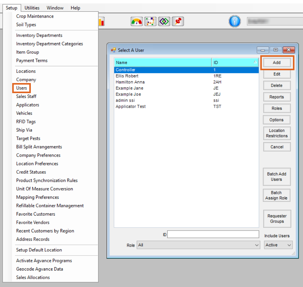 To allow a third party application to access data through the Agvance Web API, certain steps must be performed to explicitly allow that connection. This is accomplished by creating a new user in the Agvance database for use by the application. If prompted for a password to access this part of the program, please call SSI to request the password. This new Agvance User can be assigned any Role since those Roles do not apply to the API. This User should be set up with a strong password. Once set up, the User ID and Password must be supplied to the application developers or enter that User ID and Password in the appropriate location in the application.