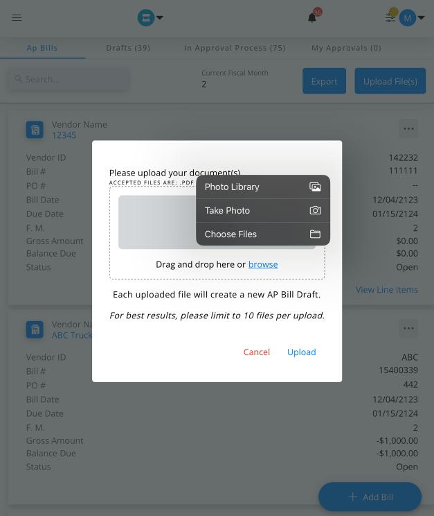 Select Upload File(s) then drag and drop the file(s) into the designated area or select browse to find the appropriate file(s). Each uploaded file will create a new AP Bill draft.