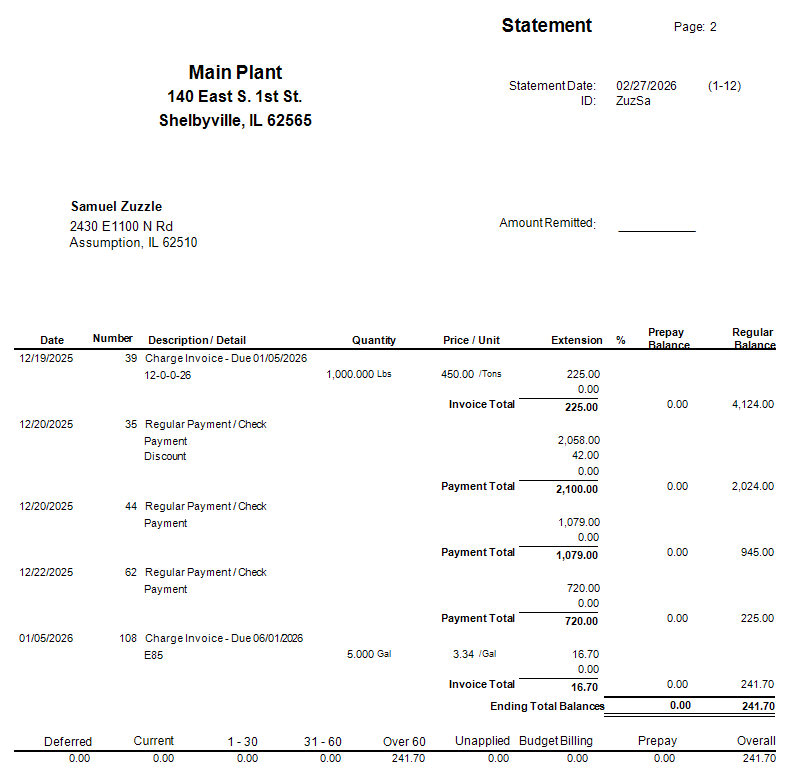 Transactions on this Statement are sorted by Transaction Date then by Transaction Number. A P is noted in the Extension column on any transaction line when either some or all of the line is prepaid. The total of the sales tax for the Customer is added in the Extension column. Additionally, a P is also noted on this sales tax amount when either some or all of the sales tax is prepaid.