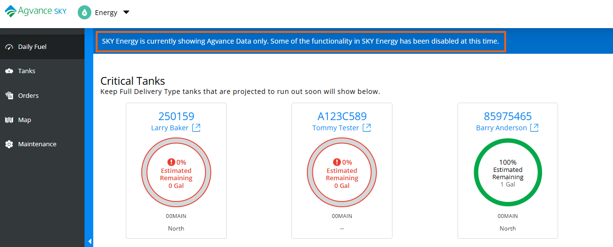 - As an Agvance and Energy Force customer, a notification displays in SKY Energy on the Daily Fuel page that SKY Energy is currently showing Agvance Data only. Some of the functionality in SKY Energy has been disabled at this time.