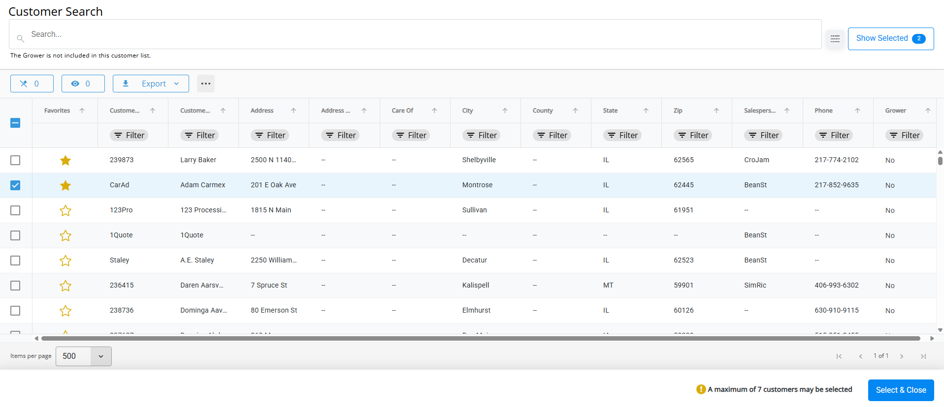 Customers can be added to Billing Splits by selecting + Add Customer. A maximum of seven Customers can be selected. Choosing Show Selected displays the Customers currently selected to be included in the split (the Grower is not included in the Customer list).