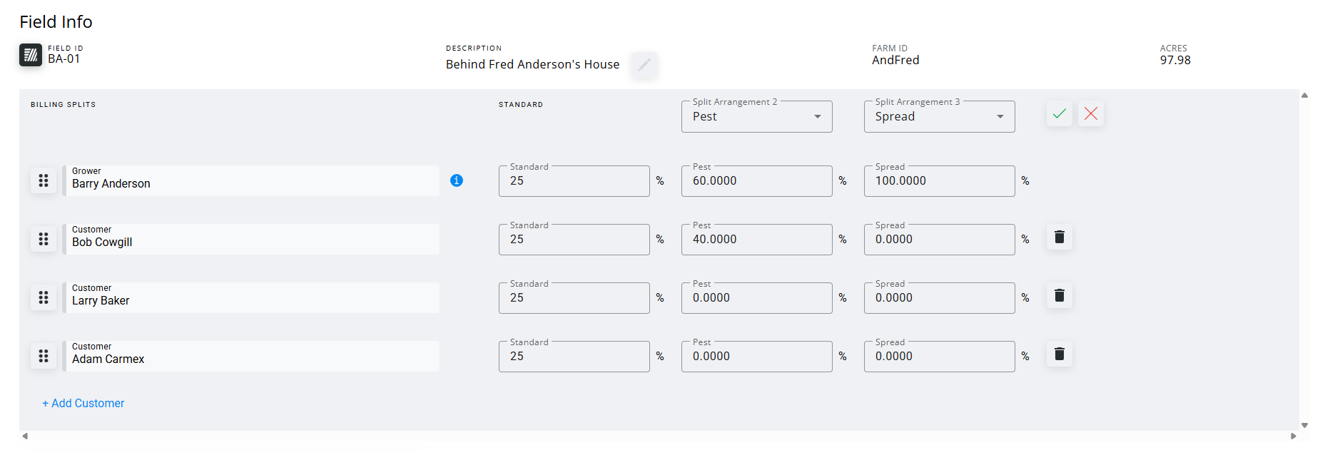 The Fields associated with the selected customer display as individual cards which include a Farm ID, Acres, and any Billing Splits established with the Field.