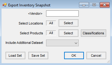 In Agvance, navigate to Accounting / Transfers / Export / Inventory Snapshot. Indicate the Vendor, Locations, and Products to be included in the export. A prior year database can also be included. Choose OK to generate the export message.