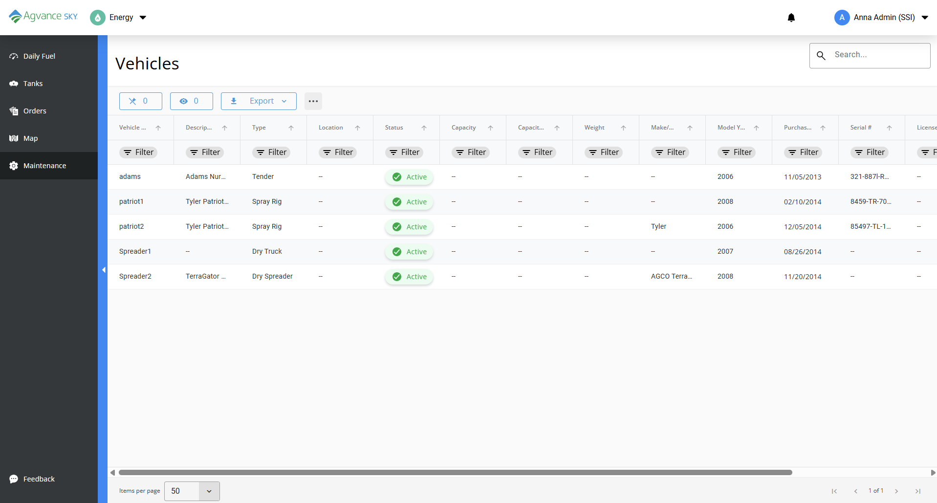 All Energy Vehicles from Windows Agvance display in a grid that operates much like an Excel spreadsheet.