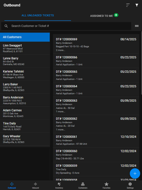 Outbound lists Delivery Tickets created in Agvance or from within the app. View All Unloaded Tickets or tickets Assigned to Me. The number on the Assigned to Me tab indicates the number of tickets currently assigned to the User who is logged into the app. The two icons in the top right give the ability to Sort or Filter tickets respectively. Tickets can be sorted by Requesting Locations, Assigned User, or Date/Time. Filter tickets by Ticket Location(s) and/or Ship From Location(s). Additionally, the Search Customer or Ticket # field can be used to locate specific tickets.