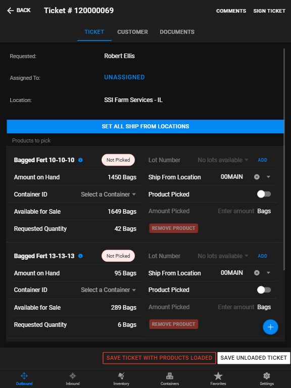 Tap Save Unloaded Ticket to save the ticket for later use if the Product has not been picked up/delivered. Save any changes made to the unloaded ticket such as the Requested Quantity, adding Lot Numbers, or assigning a Container. All changes are saved in the app and in Agvance.