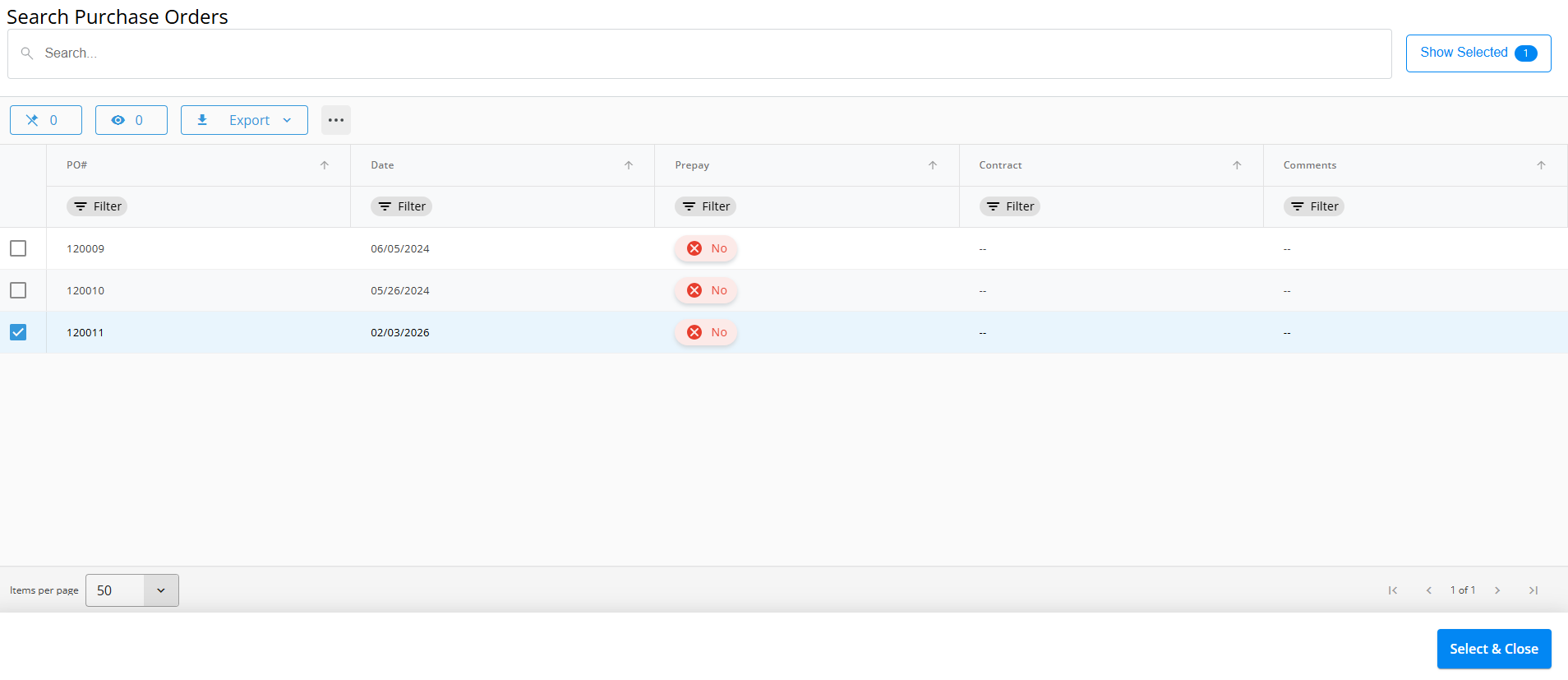 - Find and select the appropriate PO, then choose Select & Close.