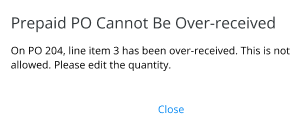 Note: If a prepaid PO was imported and the Restrict Over Receiving on Prepaid PO preference is selected on the Inventory Purchase tab at Accounting / Setup / Preferences, the following message will display: