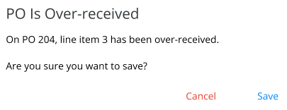 Note: If a PO was imported and the quantity on the Purchase Receipt is over the amount from the Purchase Order, the following message will display to either Cancel and edit the quantity or Save the Purchase Receipt.