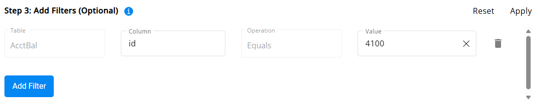 - Once a Value is entered, choose Apply. Select Reset to remove all filters.