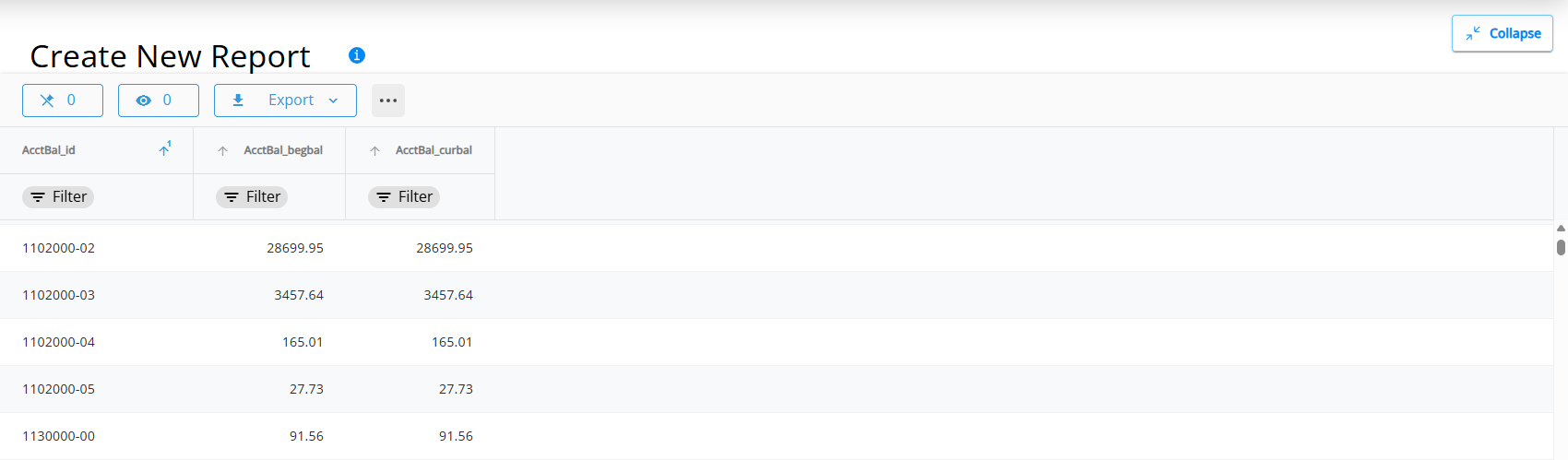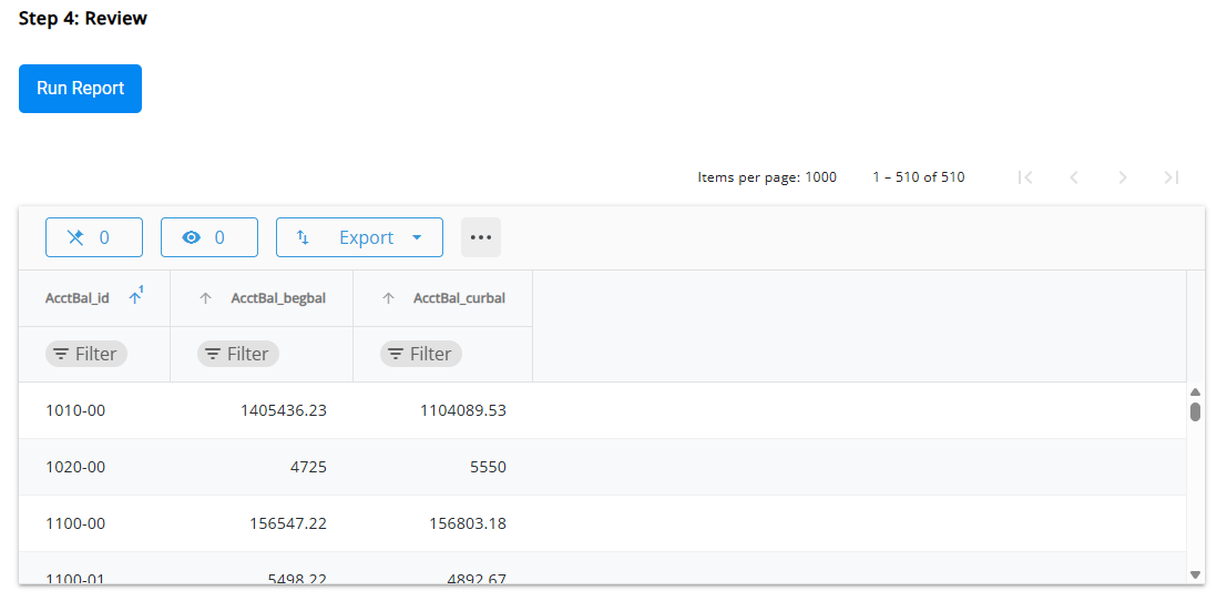 Note: If no data is found, try changing the table or column selections/filters and running the report again. - Results display in a grid with additional capabilities such as moving/hiding columns, exporting, and sorting/filtering.