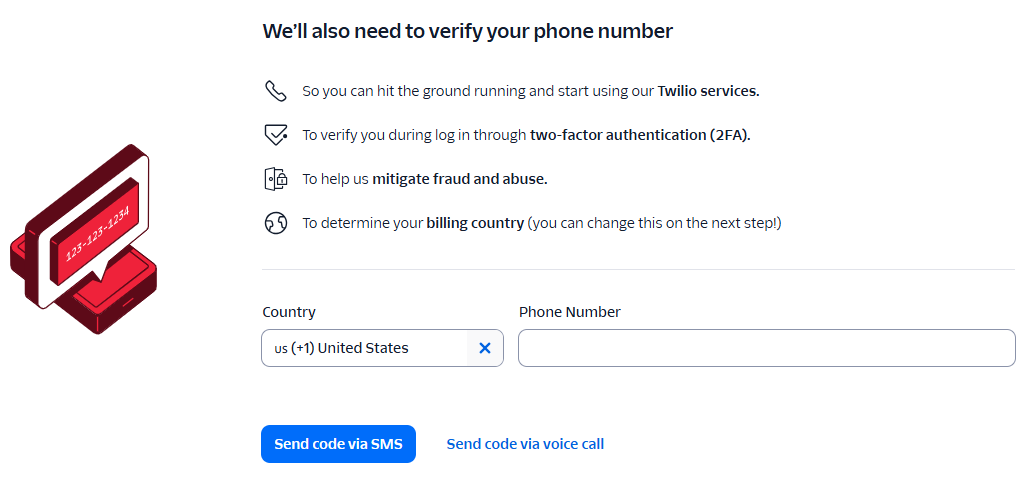 - Choose Continue, then enter a Phone Number for two-factor authentication (2FA). The code can be sent via SMS or a voice call.