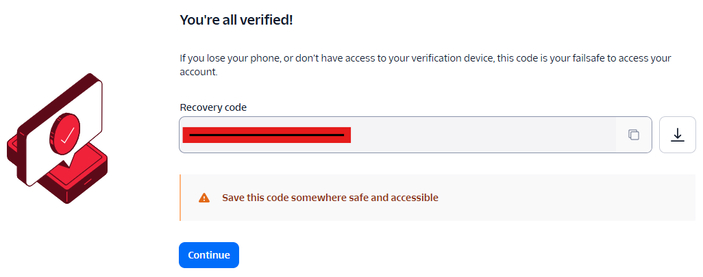 - Enter the Recovery code, which can be used as a failsafe if access to the 2FA device is lost. BE SURE TO KEEP THIS CODE IN A SAFE LOCATION. Download the code as a text file, or copy it to another location. Ensure it's saved somewhere safe and accessible in case it is ever needed.