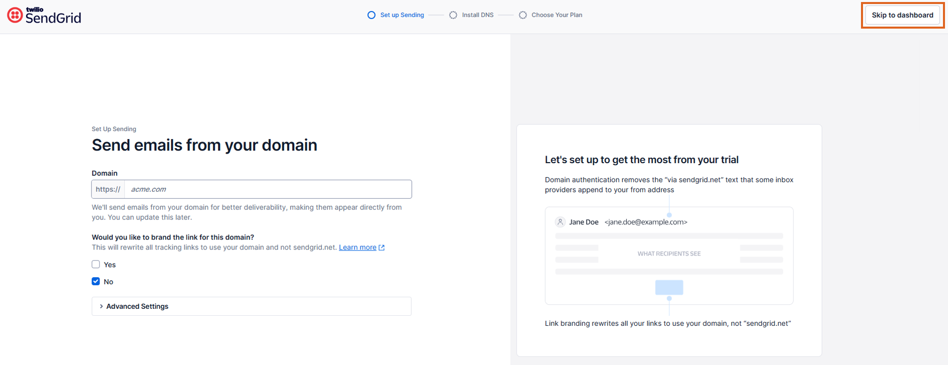 - If Skip to dashboard is selected, it is necessary to go into the settings and verify a single sender using the following steps: