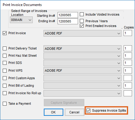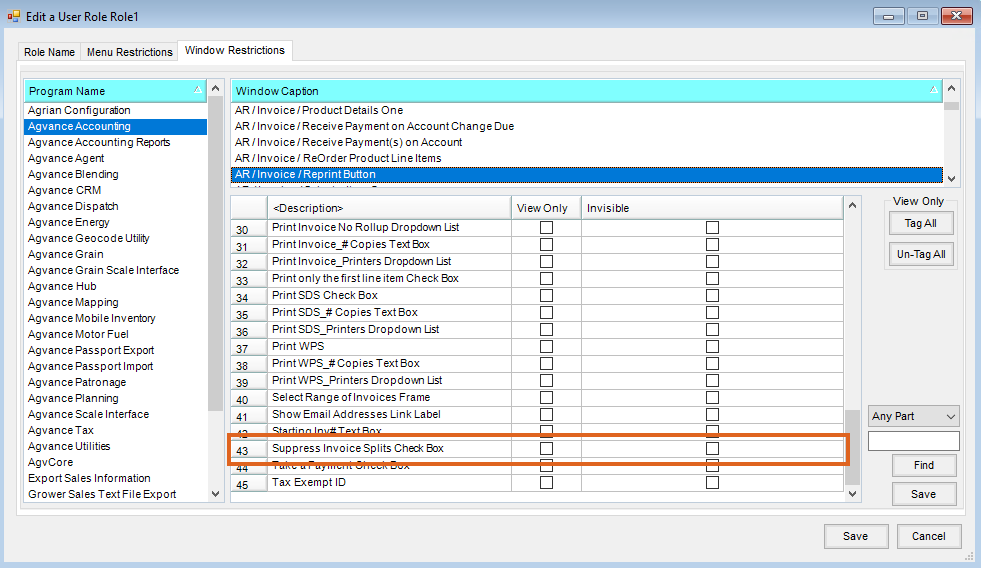 This option can be enabled/disabled for the User Role by selecting Roles at Hub / Setup / Users. On the Window Restrictions tab, choose Agvance Accounting under Program Name. Select AR / Invoice / Reprint Button in the Window Caption section. For the Suppress Invoice Splits Check Box item, check View Only so the checkbox displays but is disabled or choose Invisible to hide the checkbox altogether.