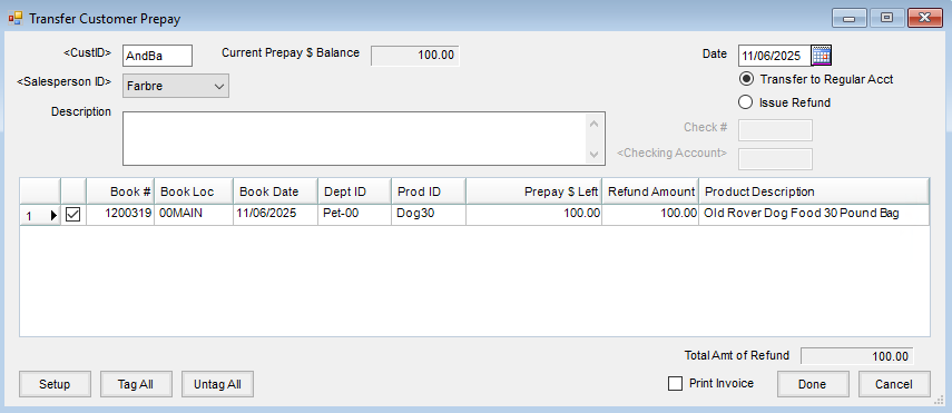 The Transfer Customer Prepay function, found at Accounting / A/R, is designed to help streamline the process used to handle leftover Prepay money. Whether transferring the balance or issuing a refund, an Invoice is created to move the selected Prepay dollars to the Regular balance, as a credit. If the Issue Refund option is used, a Quick Check is generated before the Invoice is printed.