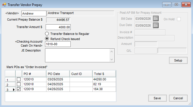 - Transfer Balance to Regular – This option removes the amount from the Vendor’s Prepay account and adds it as a negative to the Vendor’s Regular balance.
