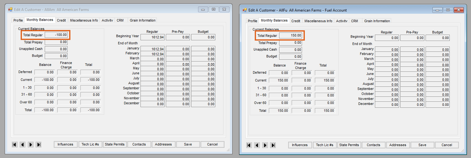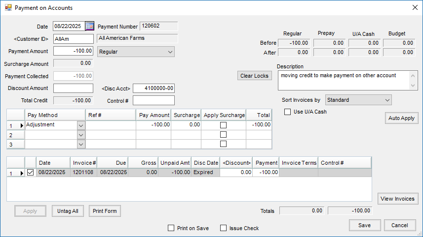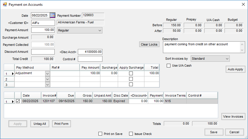 The Pay Methods used for both Payments are the same (best practice is Adjustment) and the account with a balance owed is reduced by the amount of the credit.