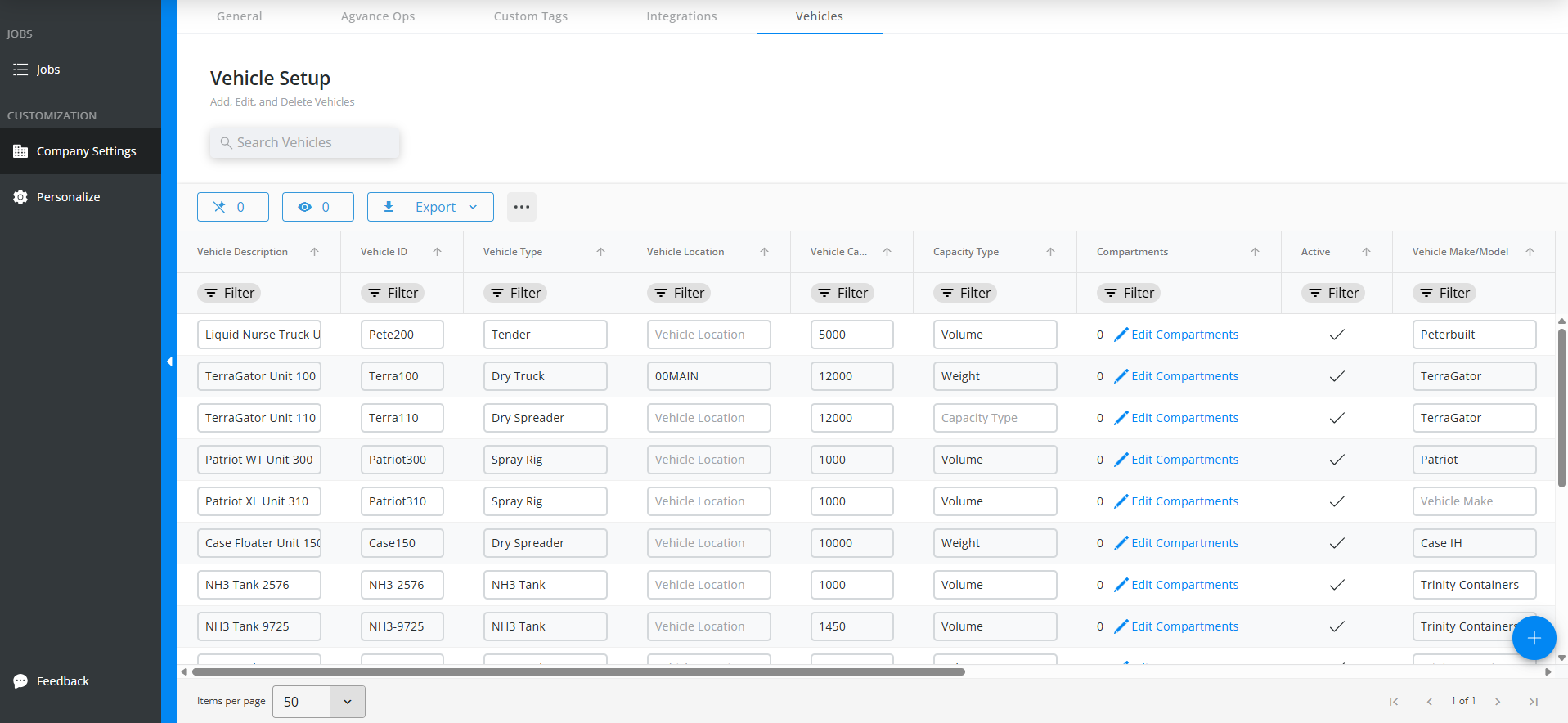 Vehicles must be enabled to be selectable within Applicator, Delivery, Tender, and Integration setups. Accurate vehicle and compartment setup ensures equipment is assigned appropriately within Dispatch processes.