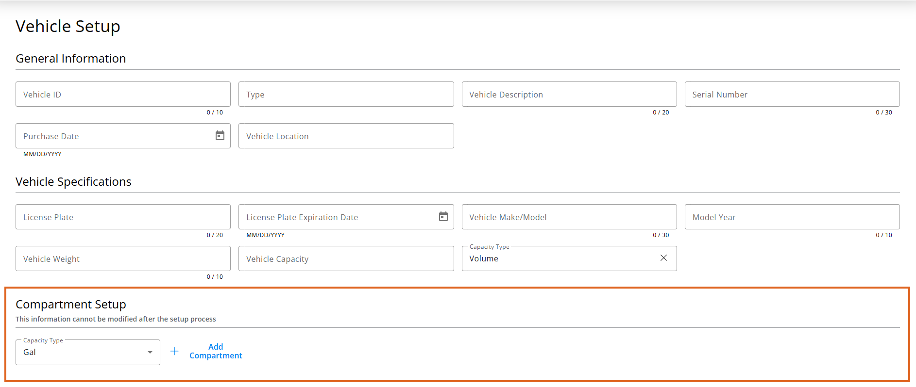 Note: Once compartments are created and saved, they cannot be edited. Compartments can be added to an existing vehicle one time only.