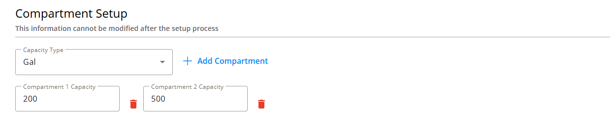A Compartment Capacity Type must be selected before compartments can be added. Capacity may be defined in Gallons or Pounds. Once compartments are created and saved, they cannot be edited. This restriction ensures consistency in capacity tracking across Dispatch workflows.